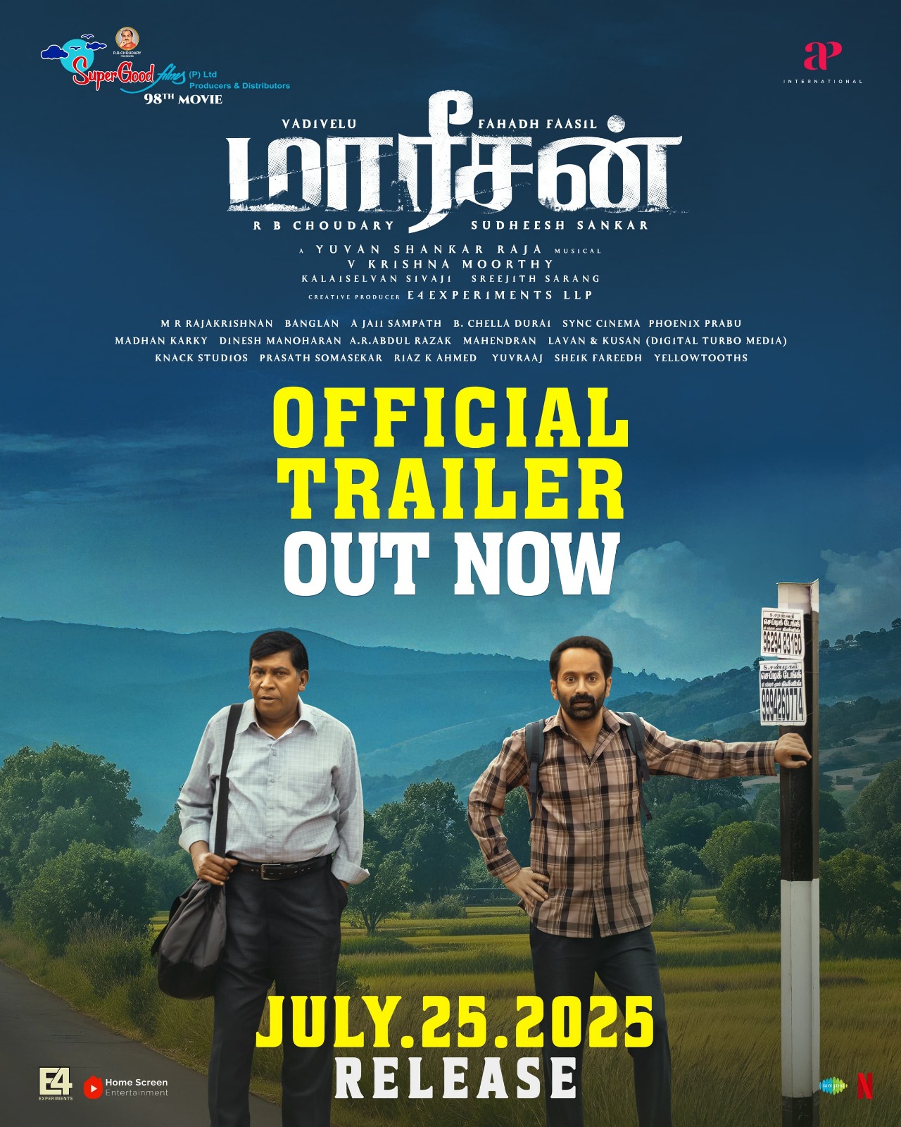 சூப்பர் குட் பிலிம்ஸ் நிறுவனம் தயாரித்திருக்கும் 98 ஆவது படத்தை இயக்குநர் சுதீஷ் சங்கர் இயக்க, தமிழ் திரையுலகின் பிரபல நடிகர்களான வடிவேலு – பகத் பாசில் இணைந்து நடித்திருக்கும் ‘மாரீசன்’ திரைப்படத்தின் ட்ரெய்லர் வெளியிடப்பட்டிருக்கிறது.