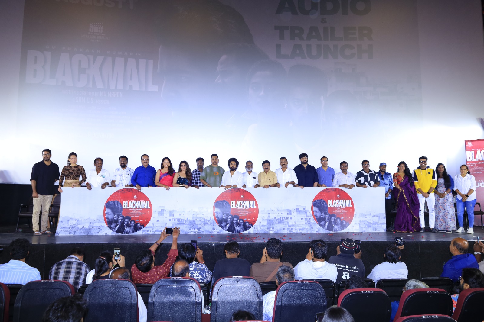 M/s. JDS ஃபிலிம் ஃபேக்டரி தயாரிப்பில் மு. மாறன் இயக்கத்தில் நடிகர்கள் ஜி.வி. பிரகாஷ், தேஜூ அஸ்வினி மற்றும் பிந்து மாதவி நடிப்பில் உருவாகி இருக்கும் திரைப்படம் ’பிளாக்மெயில்’. ஆகஸ்ட் 1 அன்று வெளியாக இருக்கும் இந்தப் படத்தின் இசை வெளியீட்டு விழா இன்று நடைபெற்றது.