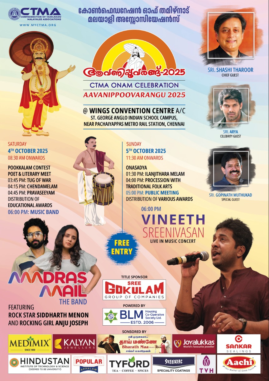 தி சென்னை தமிழ்நாடு மலையாளி சங்கம் கூட்டமைப்பின் (CTMA) வருடாந்திர முதன்மை கலாச்சார விழாவான ஆவணிப்பூவரங் 2025, அக்டோபர் 4 (சனிக்கிழமை) மற்றும் அக்டோபர் 5 (ஞாயிற்றுக்கிழமை) ஆகிய தேதிகளில் சென்னையில் நடக்கிறது. தமிழ் மற்றும் மலையாளிகளின் பண்பாடு மற்றும் கலாச்சாரத்தின் இணைவாக அமையும் இந்த இரண்டு நாள் கொண்டாட்டத்தில் ஒற்றுமை, பாரம்பரியம் மற்றும் சமூக உணர்வு ஆகியவற்றைக் காணலாம்.