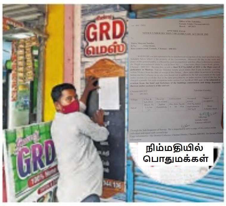 இந்த நிலையில், கிண்டி ரேஸ் கோர்ஸ் ஆக்கிரமிப்பு கடைகளை அகற்றுவதில் அரசு அதிரடி நடவடிக்கை மேற்கொண்டுள்ளது. ஆம், கிண்டி ரேஸ் கோர்ஸ் பேருந்து நிறுத்தத்தில் உள்ள ஆக்கிரமிப்பு நிலத்தில் கட்டப்பட்டுள்ள 17 கடைகளை 14 நாட்களுக்குள் அகற்ற வேண்டும், என்று நீதிமன்றம் உத்தரவிட்டுள்ளது. இதையடுத்து, 14 நாட்களுக்குள் ஆக்கிரமிப்பு நிலத்தில் உள்ள கடைகளை அகற்ற வேண்டும், என்று அப்பகுதி தாசில்தார் நோட்டீஸ் அனுப்பியுள்ளார்.