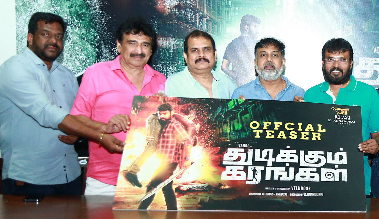 ஒடியன் டாக்கீஸ் சார்பில் அண்ணாதுரை தயாரிப்பில் உருவாகியுள்ள படம் ‘துடிக்கும் கரங்கள்’. விமல் கதாநாயகனாக நடித்துள்ள இந்தப்படத்தை வேலுதாஸ் இயக்கியுள்ளார். மேலும் வேலுதாஸ் மற்றும் காளிதாஸ் இருவரும் இணை தயாரிப்பாளர்களாக இணைந்து இந்தப்படத்தை தயாரித்துள்ளனர். மிஷா நரங் கதாநாயகியாக நடித்துள்ளார். படப்பிடிப்பு முடிவடைந்து தற்போது போஸ்ட் புரொடக்சன் பணிகள் நடைபெற்று வருகின்றன. இந்த நிலையில் இந்தப்படத்தின் டீசர் வெளியீட்டு விழா தமிழ்நாடு திரைப்பட இயக்குனர்கள் சங்க கட்டிடத்தில் பிரபல இயக்குனர்களின் முன்னிலையில் நடைபெற்றது.