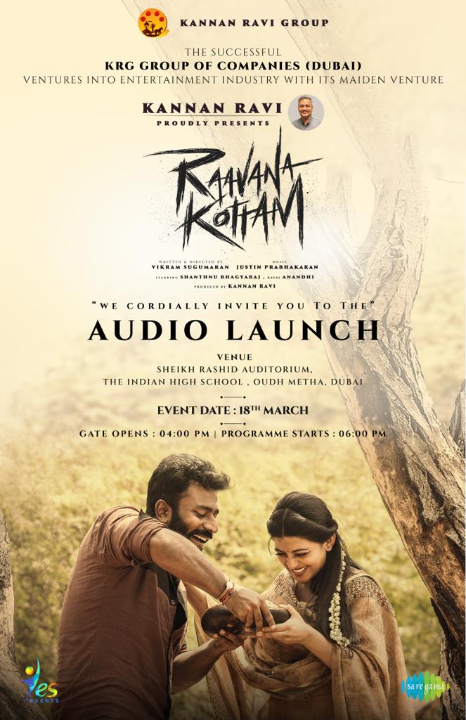 வெற்றிகரமான KRG குரூப் ஆஃப் கம்பெனிஸ் (துபாய்), ஷாந்தனு பாக்யராஜ் மற்றும் ஆனந்தி நடித்திருக்கும் ‘இராவண கோட்டம்’ மூலம் பொழுதுபோக்கு துறையில் இறங்குகிறது. தயாரிப்பாளர் திரு.கண்ணன் ரவி கூறும்போது, துபாயில் பெரும் ஆரவாரத்துக்கு மத்தியில் பெரிய ஸ்டார்களின், பெரிய படங்களின் இசை வெளியீட்டு விழாவை தமிழ் சினிமா பார்த்திருக்கிறது. இப்போது, எனது முதல் தயாரிப்பான ‘இராவண கோட்டம்’ படத்தின் இசை வெளியீட்டு விழா தி இந்தியன் ஹை ஸ்கூல், ஓத் மேத்தா, ஷேக் ரஷித் ஆடிட்டோரியத்தில் மார்ச் 18 மாலை 6 மணிக்கு நடைபெறவுள்ளது.