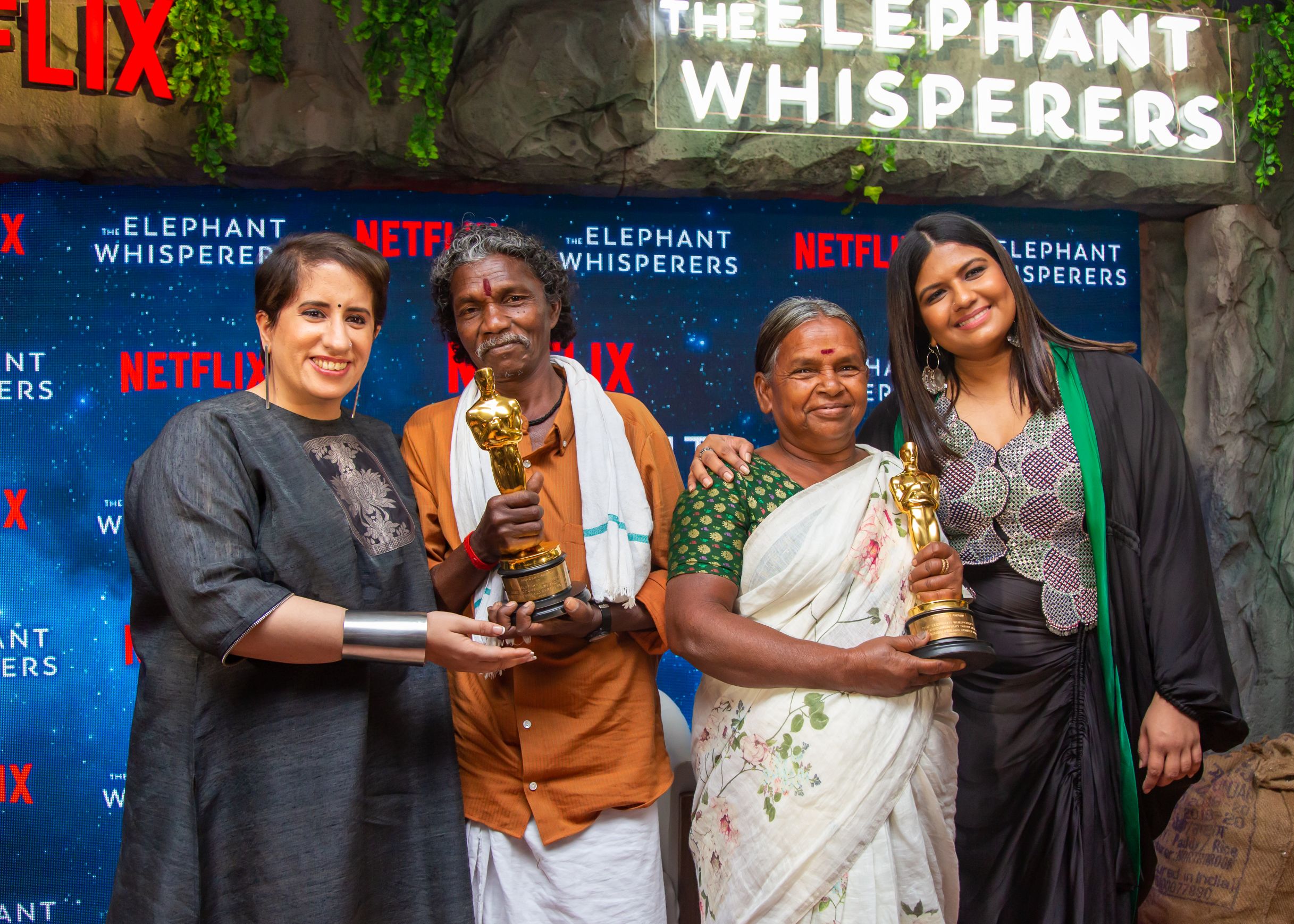 4) The victorious team of @guneetmonga & @kartikigonsalves with Bomman & Bellie share their emotions and insights at the Press Conference for #TheElephantWhisperers after their triumphant win at the Oscars. A true moment of national pride! @netflix_in #GuneetMonga #KartikiGonsalves #SikhyaEntertainment