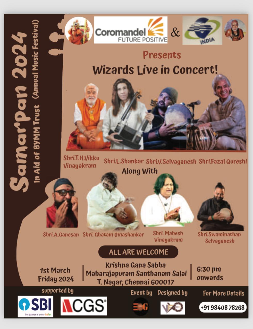 விசார்ட்ஸ் லைவ் இன் கான்செர்ட் (Wizards Live in Concert) என்ற பெயரில், சமர்ப்பன் 2024 வருடாந்திர இசை விழாவின் ஒரு பகுதியாக நடைபெறவுள்ள இந்த நிகழ்ச்சி பி ஒய் எம் எம் (BYMM) அறக்கட்டளைக்கு உதவும் நோக்கில் திட்டமிடப்பட்டுள்ளது. மார்ச் 1ம் தேதி (வெள்ளிக்கிழமை) மாலை 6.30 மணி முதல் சென்னை தி. நகர் மகாராஜபுரம் சந்தானம் சாலை கிருஷ்ண கான சபாவில் இந்த இசை நிகழ்ச்சி நடைபெறுகிறது. கோரமண்டல் ஃபியூச்சர் பாசிட்டிவ் மற்றும் WWE குளோபல் இந்தியா பிரைவேட் லிமிடெட் இந்நிகழ்ச்சியை வழங்குகின்றன.
